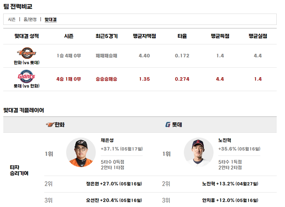 상대전적은 롯데가 4승 1패로 압도적이다 평균자책점, 타율 모든 것이 앞선다