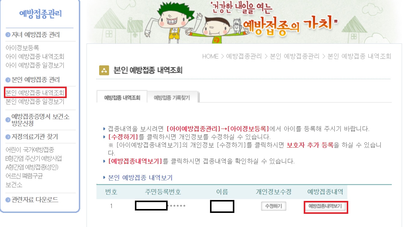예방접종관리-본인 예방접종 관리에 들어가서 내역을 확인하면 되겠죠~