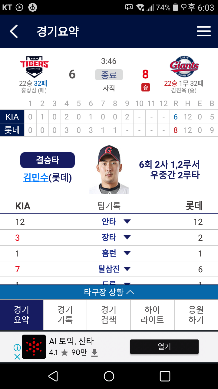 4회 초 기아 박찬호 선수의 우익수 뒤 2루타로 점수는