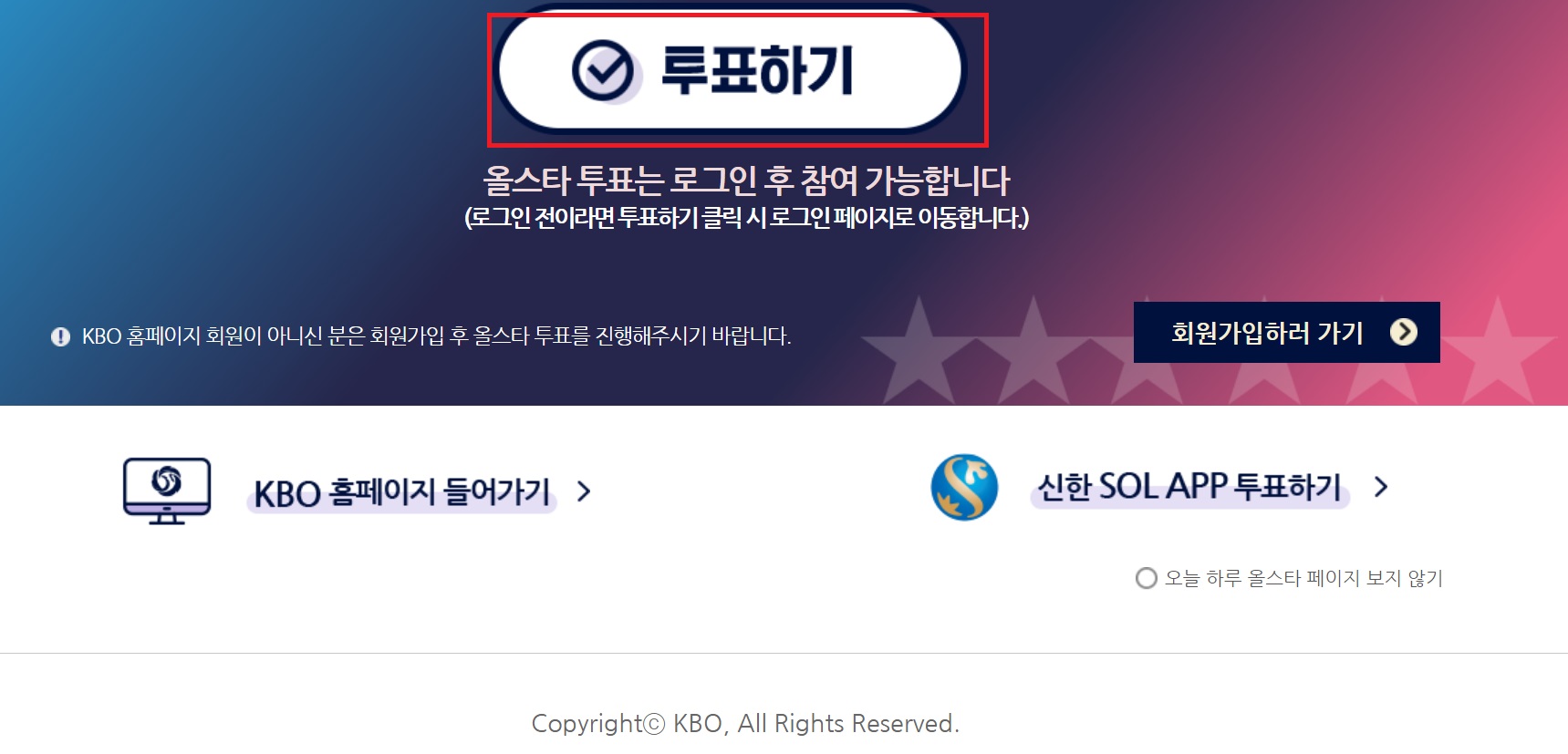 kbo 홈페이지에서 할 때는 로그인을 해야 투표를 할 수 있습니다.