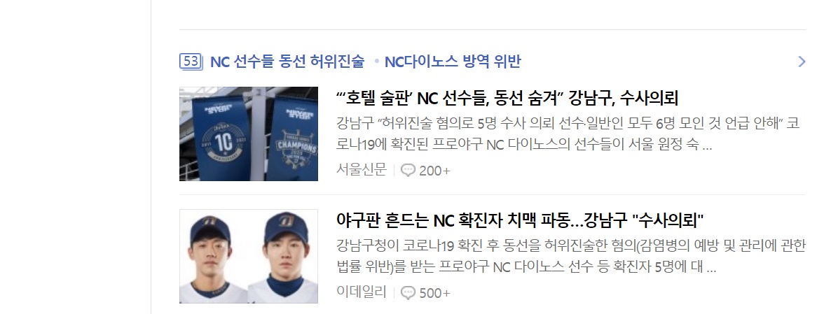 | nc 일부 선수가 호텔 방에서 술판 벌였다? 방역수칙 위반 아닌가? (0) | 2021.07.13 |